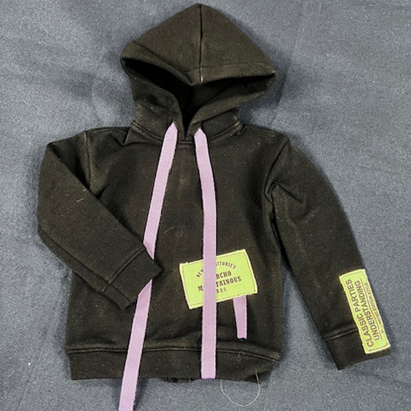 • Black hoodie with purple tie.