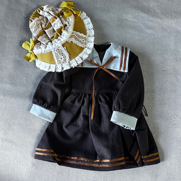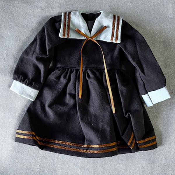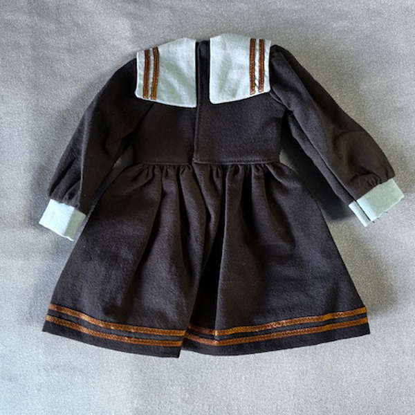 • Dark brown/black sailor dress with pale blue collar and cuffs.