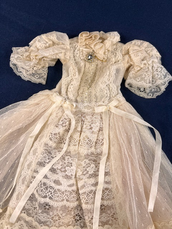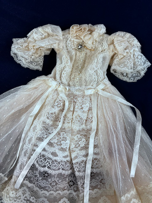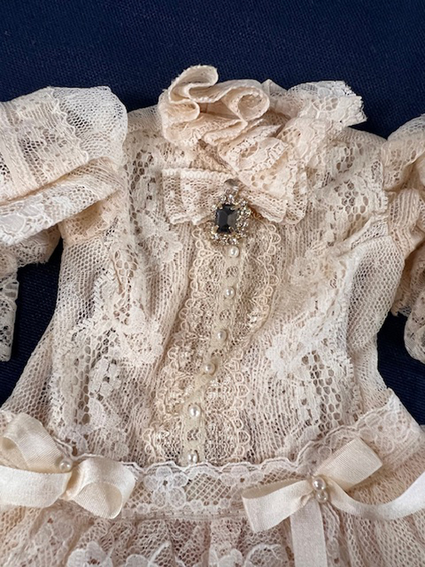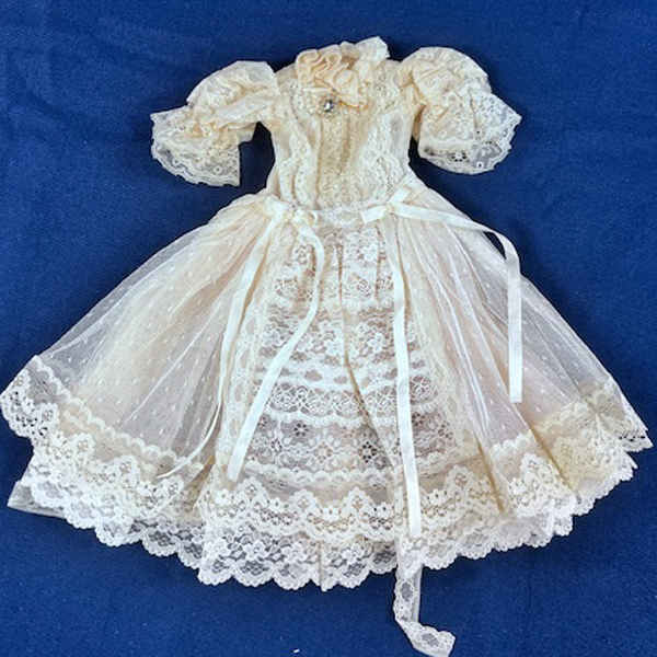 • Off white lace dress with a pale peach net underskirt.