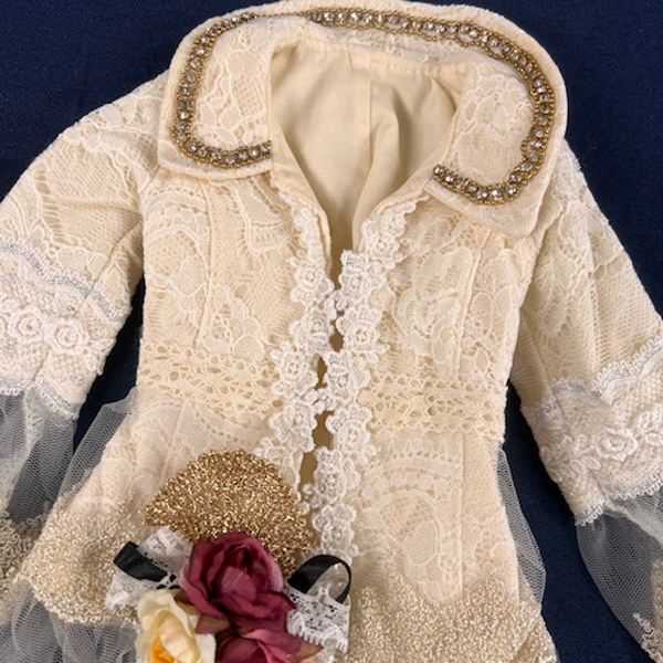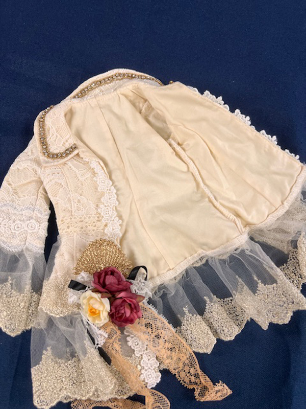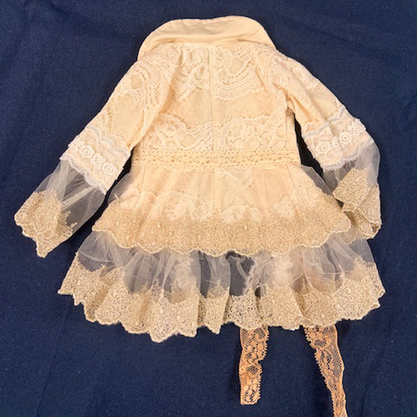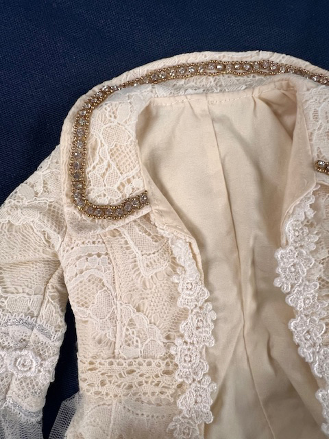 • Cream formal coat with white & gold lace trim and floral detail at hip.